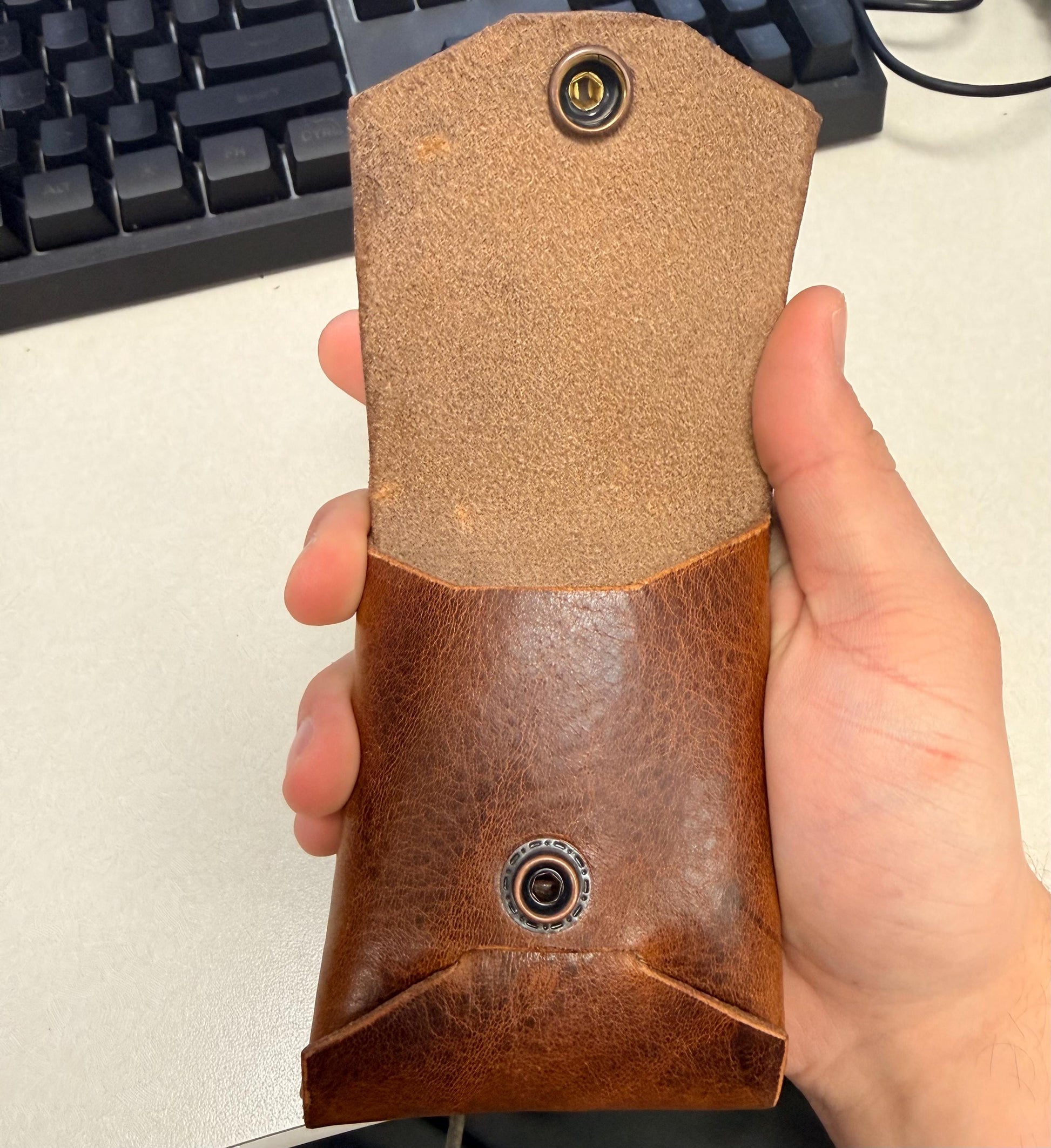 Prices are determined by the cost of the leather, the amount of leather the product uses, tool maintenance, and the time it takes to create the product. Stock amount are not premade inventory, the amount in stock depends on the amount of leather I currently have to create the product.